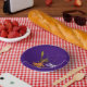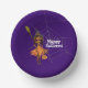 Moderne grafische glückliche Halloween Party Platte. Originelles Design und Illustration mit einem niedlichen, dunkelhaarigen Mädchen, das als Hexe verkleidet ist und einen Broomstick und Kürbis von Sarah Trett für www.mylittleeden.com hält