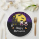 Dieser lustige und spukhafte Teller besticht durch niedliche Vampire neben einem gekräuselten Spuk Haus. Im Hintergrund ist ein Vollmond mit Fledermäusen und ein lila Nachthimmel mit Sternen. Das ist perfekt für ein Halloween-Party.