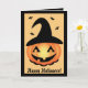 Dieses Grußkartendesign besticht durch einen niedlichen Kürbis mit einem Hexenhut. Die Farben sind orange und schwarz. Der Hintergrund ist ein gelb-weißes Netz mit im Hintergrund fliegenden Fledermäusen. So niedlich für die Halloween-Saison! Ein tolles Design für Kinder, Jugendliche und Erwachsene gleichermaßen.