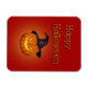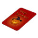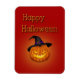 Glückliche Halloween-Illustration mit einem Jack-oder-Laternen Kürbis mit einem Hexenhut und "Happy Halloween" geschrieben mit Knochenbriefen auf rotem Hintergrund.