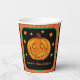 Halloween-Party Tassen für Groß und Klein mit einem großen orangefarbenen Kürbis als Mittelpunkt. Es hat ein leuchtendes, grinsendes, geschnitztes Gesicht. Unter dem Kürbis ist eine Vorlage in orangefarbenem Text, die Happy Halloween liest. Dies kann so verlassen werden, wie es ist, oder mit dem Vorlagenfeld durch eine eigene Nachricht oder einen eigenen Text ersetzt werden. Der Kürbis und der Text sind in einem schwarzen Quadrat mit orangefarbenen Sternen platziert, am Rand der Becher sind helle und dunkelorange Streifen. Spaß für ein spukhaftes Party für Familie und Freund.