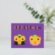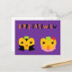 Glückliche Halloween Pumpkins Postkarte. Auf der individuell gestaltbaren Postkarte befinden sich zwei niedliche Kürbis in Vampirkostüme und auf einem lila Hintergrund ein Happy Halloween in orangefarbenen und schwarzen Buchstaben.