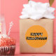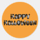Orange Happy Halloween Aufkleber mit kleinen weißen Schädeln.