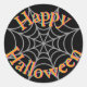 Ein glücklicher Halloween-Aufkleber mit Spinnennetzhintergrund. Ideal als Umschlag Aufkleber, Gaben oder auf Karten.