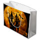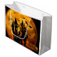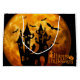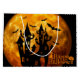 Dieses Design bietet einen glücklichen Halloween-Gruß mit einem Bild von Vollmond, das in einem sprichwörtlichen Farbton von hellen Orange beleuchtet ist. Sie können auch ein Spuk Haus und Fledermäuse sehen, die in der Luft fliegen. Neben dem Text befinden sich zwei kleine Bilder: eines von einer Katze und eines anderen von einem Kürbis, die beide mit Halloween assoziiert sind.