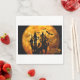 Dieses Design bietet einen glücklichen Halloween-Gruß mit einem Bild von Vollmond, das in einem sprichwörtlichen Farbton von hellen Orange beleuchtet ist. Sie können auch ein Spuk Haus und Fledermäuse sehen, die in der Luft fliegen. Neben dem Text befinden sich zwei kleine Bilder: eines von einer Katze und eines anderen von einem Kürbis, die beide mit Halloween assoziiert sind.