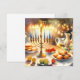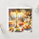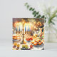 Hanukkah Aquarellbild. Ein wunderschön gestaltetes Set für eine festliche Feier mit einer traditionellen Menorah mit Kerzen. Das weiche, warme Licht, die Dekoration der Ferien verleiht dem Ganzen eine Touch Beifall. Warme Lichter schaffen eine gemütliche und einladende Atmosphäre.