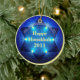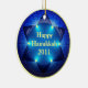 Ein helles, einzigartiges Hanukkah-Ornament mit dem Stern von David und beleuchtete Lichter auf einem blauen Hintergrund mit "Happy Hanukkah 2011" auf beiden Seiten in hellgelbem Text. Ändern Sie den Text einfach oder löschen Sie ihn, wenn nicht nötig. Das Bilddesign ist auf der einen Seite dieses wunderschönen Keramik-Ornaments, das gezeigt wird, und die andere Seite ist leer. Diese Zierversion hat das Aussehen eines 3D-Glashalls! Der perfekte Hanukkah-Sake für 2011!