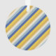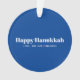 Happy Hanukkah blau-weiß moderne Typografie personalisiert Hanukkah Ornament. Vollständig anpassbarer weißer Text auf blauem, massiven Farbhintergrund auf der Vorderseite und diagonal blaues goldgelbes und cremegestreiftes Muster auf der Rückseite.