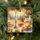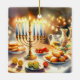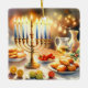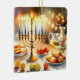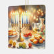 Hanukkah Aquarellbild. Ein wunderschön gestaltetes Set für eine festliche Feier mit einer traditionellen Menorah mit Kerzen. Das weiche, warme Licht, die Dekoration der Ferien verleiht dem Ganzen eine Touch Beifall. Warme Lichter schaffen eine gemütliche und einladende Atmosphäre.