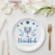 Diese Happy Hanukkah Teller verfügen über eine 9-Achter-Menorah, chanukkiah, mit blauen Sternen, Olivenzweigen und anderen Elementen in hellblau und dunkelblau. Fügen Sie weitere Party-Vorräte mit dem gleichen Design, um Ihre Tischdekoration zu koordinieren.