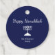 Happy Hanukkah Blue Holiday Party Gunst Tag, mit einem einfachen weißen menorah und Schrift Typografie Design. Mit einer weißen, anpassbaren Schrift können Sie Ihre eigenen Informationen hinzufügen. Eine festliche Art, mit Freunden und Lieben zu feiern.