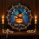 Wünschen Sie allen ein "Happy Haunting" mit diesem mystischen Runddesign. Es ist mit einer schwarzen Katze mit hellgrünen Augen auf einem Stapel glühender Jack-o'-Laternen versehen. Die spukhafte Szene umfasst halbmondfarbene Monde, Sterne, Fledermäuse und glühende Pilze, alles Set in einem Kürbisgeflecht. Ein perfektes Halloween-Akzent.