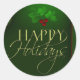 Dunkelgrüne Aufkleber mit heiligen Beeren und Happy Holidays im goldenen Script-Schriftart.