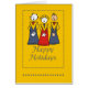 Individuell gestaltbare Urlaubskarten mit 3 Chordamen, einem gelben Hintergrund und dem Sprichwort Happy Holidays. Große Karten für Familien und Freunde während der Ferienzeit.