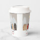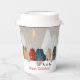 Diese Papiertassen aus Party bieten eine Reihe antiker Zuhause vor den Bergen. Blauvögel pflücken, was von den roten Beeren auf den Büschen links wird. Sie sagen "Happy Holidays" unten in rot.