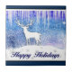 Original Aquarellmalerei von Sandra Gale mit einer Silhouette von Weißwild, majestätisch stehend zwischen Räumen und Schnee. Besonders perfekt als Alternative zu einer Weihnachtskarte, die sich eher auf den Zauber der Winterferien konzentriert.