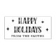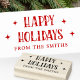 Winterurlaub Gummi Briefmarke mit dem Text "Happy Holidays" in einem festlichen Schriftart flankiert von Retrostars und Ihrem Namen unten.