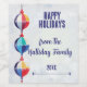 Happy Holidays text with your name and the year with lightly frosted retro Christmas ornaments. Bring this to the holiday party.