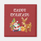 Eine niedliche Illustration mit dem Urlaubssinn. Der Weihnachtsmann trägt seinen Geschenksack und winkt hallo. Sein Rentierfreund an seiner Seite, an einem verzierten Weihnachtsbaum hängen, mit Geschenken überall herum. Set auf einem roten Hintergrund mit skurrilen Kreisen. Ein fröhliches und fröhliches Design. Happy Holidays geschrieben in einem kühnen, blockigen weißen Schriftart.