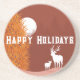 Happy Holidays Typografie auf Feiertagsthemen-Hintergrund in braun, einschließlich Weihnachtsbäume, Mond und die Rentiere.