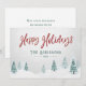 Rustikale Landurlaubskarten mit "Happy Holidays" in handgeschriebenem Stil, mit Ihrem personalisierten Familiennamen oder Familiennamen und dem Jahr, alles in Rot & Pine Vintage Typografie. Ein wunderschöner landschaftlicher Blick auf Bäume und Winterschnee in Aquarellkunst hebt die Vorderseite der Karte hervor. Die Rückseite der Karte bietet Textfläche für Ihre persönliche Urlaubsnachricht oder kann für Sie leer verlassen werden, um bei Bedarf eine Handschrift zu schreiben. Erhältlich in hochwertigem gedrucktem Kartenmaterial für Standard-Mailings oder als digitales Format zum Herunterladen und schnellen und unkomplizierten Versenden per SMS, E-Mail oder sogar Selbstdruck.