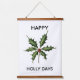 This whimsical tapestry features a vibrant sprig of Holly and the text 'Happy Holly Days.' Perfect for a minimalist Christmas season decorating style.
