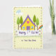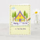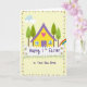 This design shows a cheerful yellow house with a purple roof, a small pink heart on the front hinting at a close bond inside, and two fresh spring-green trees standing just behind it 🌷. A white picket fence runs across the lower foreground, dotted with little sun-like flowers that feel like friendly waves from the garden. The main message sits centered over the fence area in a dark, handwritten-style lettering, with a smaller line of text placed just below it in a softer shade for contrast. Above the roofline, pale blue-and-white clouds drift across a light yellow sky, keeping the scene airy and gentle. On the right side, a rainbow curves inward toward the house as if guiding someone home, adding a sweet, togetherness-in-the-air kind of mood 🐰. Around the edges, scattered blossoms and leafy sprigs form a colorful frame that makes the whole scene feel like a springtime garden page. Tiny daisy shapes repeat along the fence rails, with small petals and dots carefully spaced between the pickets.