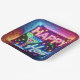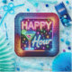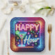 Das helle und farbenfrohe Neonschild zeigt "Happy Hour" neben einem lebendigen Cocktailglas an einer Backsteinwand