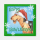 Feiern Sie die Urlaubssaison mit einem glücklichen Airedale Terrier mit einer Weihnachtsmannmütze, umgeben von Schneeflocken und den Worten, Happy Howlidays! Eine tolle Geschenkidee für Familie und Freunde, die Airedale lieben.
