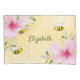 Süße Träume! Gelber, weißer Hintergrund mit Wabenmuster. Blume mit rosa tropischen Blumen, Hibiskus und Hummeln. Vorlage für Ihren Namen. Grüner Text mit Buchstaben. Ideal für Ihre Zuhause im Sommer! Zurück: ohne Design