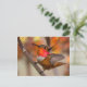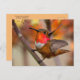 Postkarte mit einem orangefarbenen, rosafarbenen Kolibri, der auf einem Ast steht und seine Flügel in einer glücklichen Pose ausstreckt. Er zeigt auch seine schönen irisierenden orangefarbenen Rachenfedern (Gorget). Fun Card für Kolibri-, Natur- und Gartenliebhaber! Foto aufgenommen in Arcadia, Kalifornien.