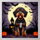 Ein schöner, schwarz-brauner Hund sitzend inmitten eines Halloween-Themas mit Vollmond, fliegenden Fledermäusen und glühenden Jack-o'-Laternen, die eine festliche und sprichwörtliche Herbstatmosphäre schaffen.