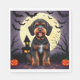 Ein schöner, schwarz-brauner Hund sitzend inmitten eines Halloween-Themas mit Vollmond, fliegenden Fledermäusen und glühenden Jack-o'-Laternen, die eine festliche und sprichwörtliche Herbstatmosphäre schaffen.