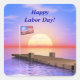Stickers mit meinem Computerwerk von einer Ende des Sommers Szene eines Docks auf dem See mit der amerikanischen Flagge und einer untergehenden Sonne. In dem Text steht "Happy Labour Day".
