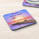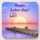 Beverage coaster with my original end-of-summer image of a dock, the American flag and a setting sun. Customizable text says "Happy Labor Day!"