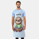 Schürze mit einer anmutigen Abbildung mit einem glücklich aussehenden Faultier mit einem grünen T - Shirt. Sitzen quergestapelt aussehen entspannt.