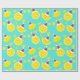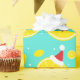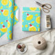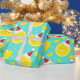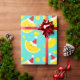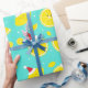 Umhüllungspapier mit einem Muster lächelnder Zitronen, die Weihnachtsmannmützen auf einem hellen aquamarinen Hintergrund tragen.