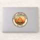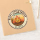 Dieser personalisierte und lustige Aufkleber verfügt über ein lächelndes Lagerfeuer mit einem Marshmallow auf einem Stock, Set vor einem Retro-Streifen Hintergrund von Sonnenuntergangsfarben. Das Design ist in einem runden Abzeichen mit dem Text "HAPPY LITTLE CAMPER" eingeschlossen.