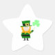 Ein glücklicher Kobold hält ein irisches Kleeblatt.