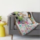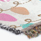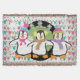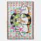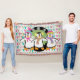 Happy Little Pinguins Urlaubsdecke mit drei niedlichen Pinguinen in Ohrmuffs, Winterhütten und Schals auf weißem Hintergrund mit bunten Lichterketten, einem schwarzen Streifen mit weißen Schneeflocken und einem grünen Zentrum mit weißen Polka-Punkten.