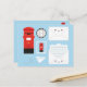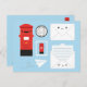Kawaii Postkasten, Brief, Briefmarke, Briefumschläge und Flugzeug auf einem blauen Hintergrund.