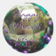 Foto von Mardi Gras Perlen mit einer großen Goldperle und dem Gruß "Happy Mardi Gras". Die Perlenfarben sind goldfarben, lila und grün gehalten, die Mardi Gras feiert. Die Perlen werden auch als "Werfen" bezeichnet, da sie von Krewmitgliedern zu den Leuten geworfen werden, die die Parade schweben sehen. Die Mardi Gras Aufkleber und Aufkleber können personalisiert sein, um Ihre eigene Nachricht hinzuzufügen.