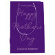 Front: Glücklicher Muttertag ist in einem Lavendelskript auf einer königlichen lila Muttertagsgeschenktasche. Oben ist ein blassrosa Herz. Der Text für den Namen des Empfängers ist ganz unten. Alle Texte können bearbeitet oder gelöscht werden.
