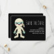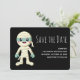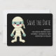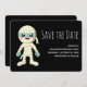 Save the Date Karte mit einem coolen Halloween-Bild. Eine Mumie, die alle in seinen Verbänden eingewickelt ist. Frohes Lächeln Gesicht. Eine spuke, niedliche, bezaubernde Kreatur.