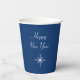 Happy New Year Blue-White-Paper Cup, mit einem Schneeflockendesign und individualisierbaren typografischen Schriftzeichen. Eine festliche Ergänzung zu Ihrem Party- oder Winterfest im Neujahr.