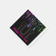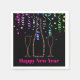 Colorful paper party napkins with bottle of champagne and glasses outlined with colored lights and streamers against a black background for New Years Eve celebration.