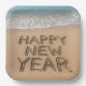 The words "Happy New Year" are beautifully etched into the sand of a pristine beach, as gentle waves caress the shoreline