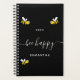 Mit fröhlichen, lächelnden, gelben und schwarzen Hummeln dekoriert. Ein schicker schwarzer Hintergrund. Weiße Schrift mit Swashes und den Text: Bee Happy. Personalisieren und fügen Sie Ihren Namen und ein Jahr. Ideal für Schule, Arbeit oder Organisation Ihres Privat-/Familienlebens.