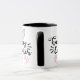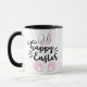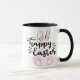 Diese zweifarbige Tasse mit rosafarbenen, sonnigen Ohren und sonnigen Füßen, in einem schwarzen Dekorationsskript "Happy Oaster".